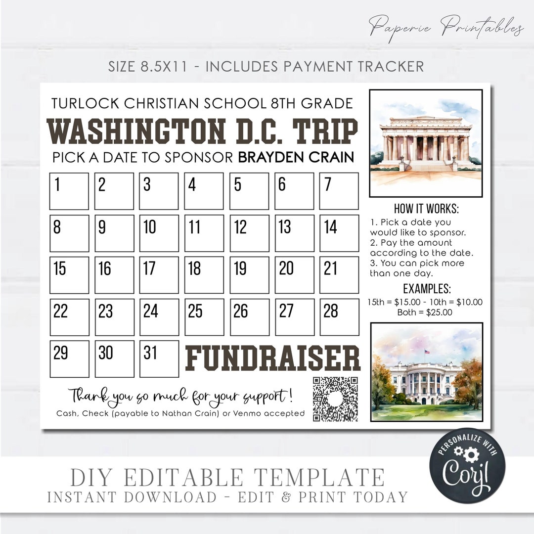 EDITABLE Calendar Fundraiser Template Washington D C Trip Fundraiser