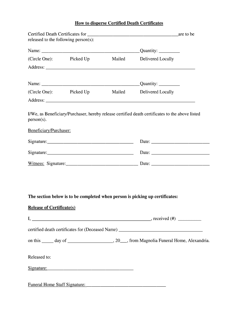 Fillable Online Release of Death Certificates Form Magnolia Funeral