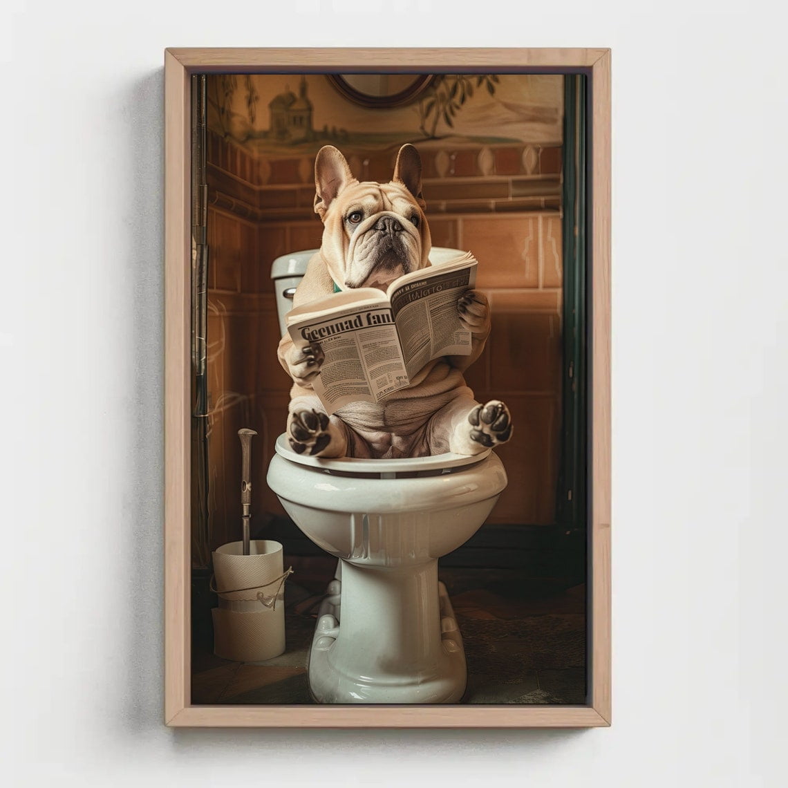 Bulldog Reading Newspaper Sitting On A Toilet Canvas Print Funny