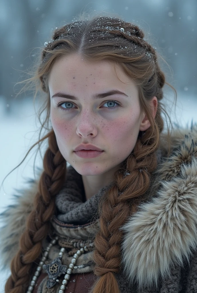 Close up portrait of a Scandinavian Viking era woman in fur lined cloak