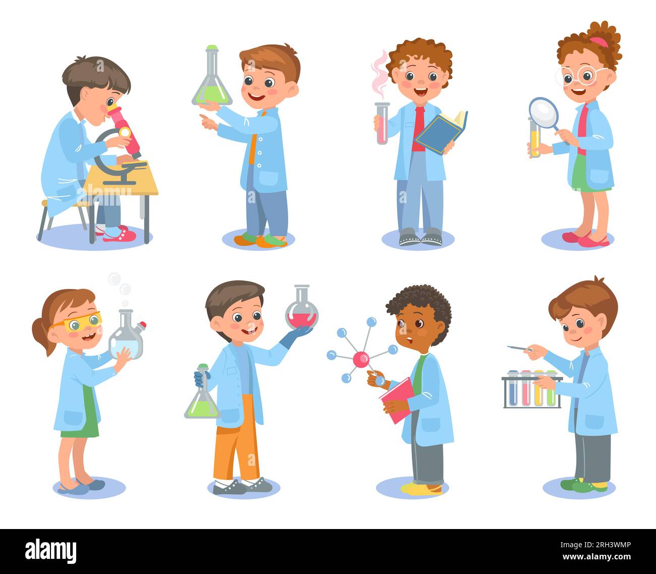 Little scientists Kids in lab coats hold test tubes Chemical flasks