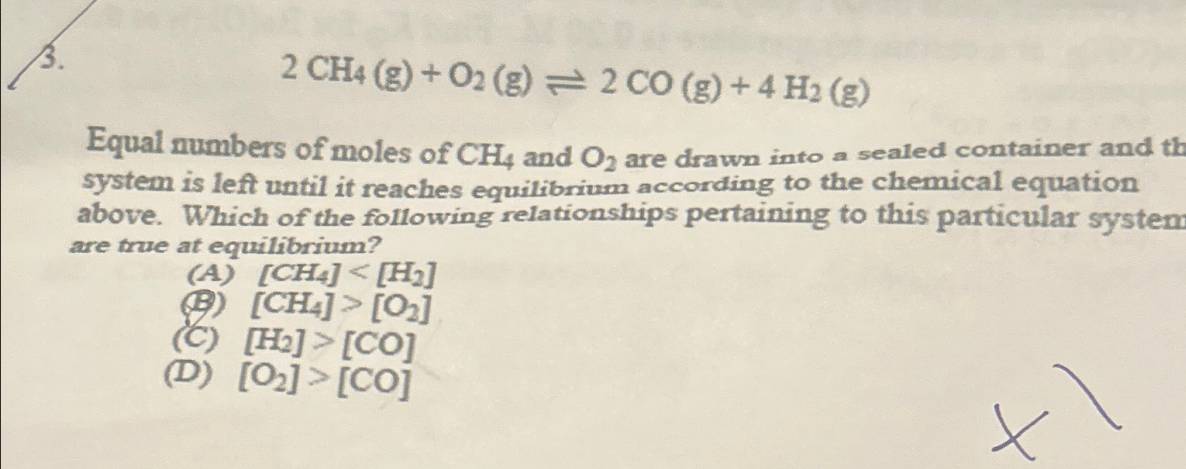 Solved 2CH4(g) O2(g)⇌2CO(g) 4H2(g)Equal numbers of moles of Chegg com