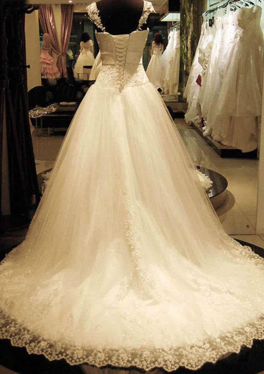 Ball Gown Square Neck Court Train Lace Tulle Dropped Waist Wedding Dre