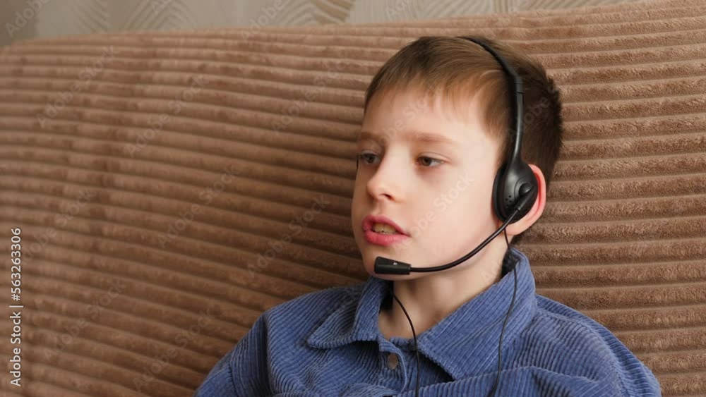 caucasian boy 9 years old in headphones with a microphone with a