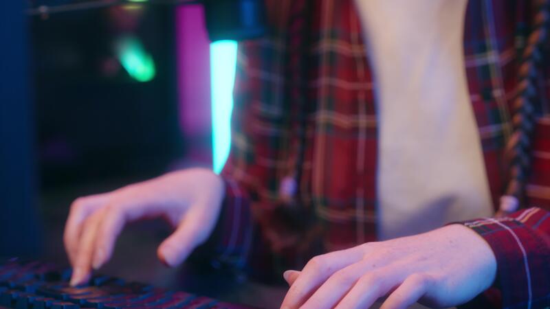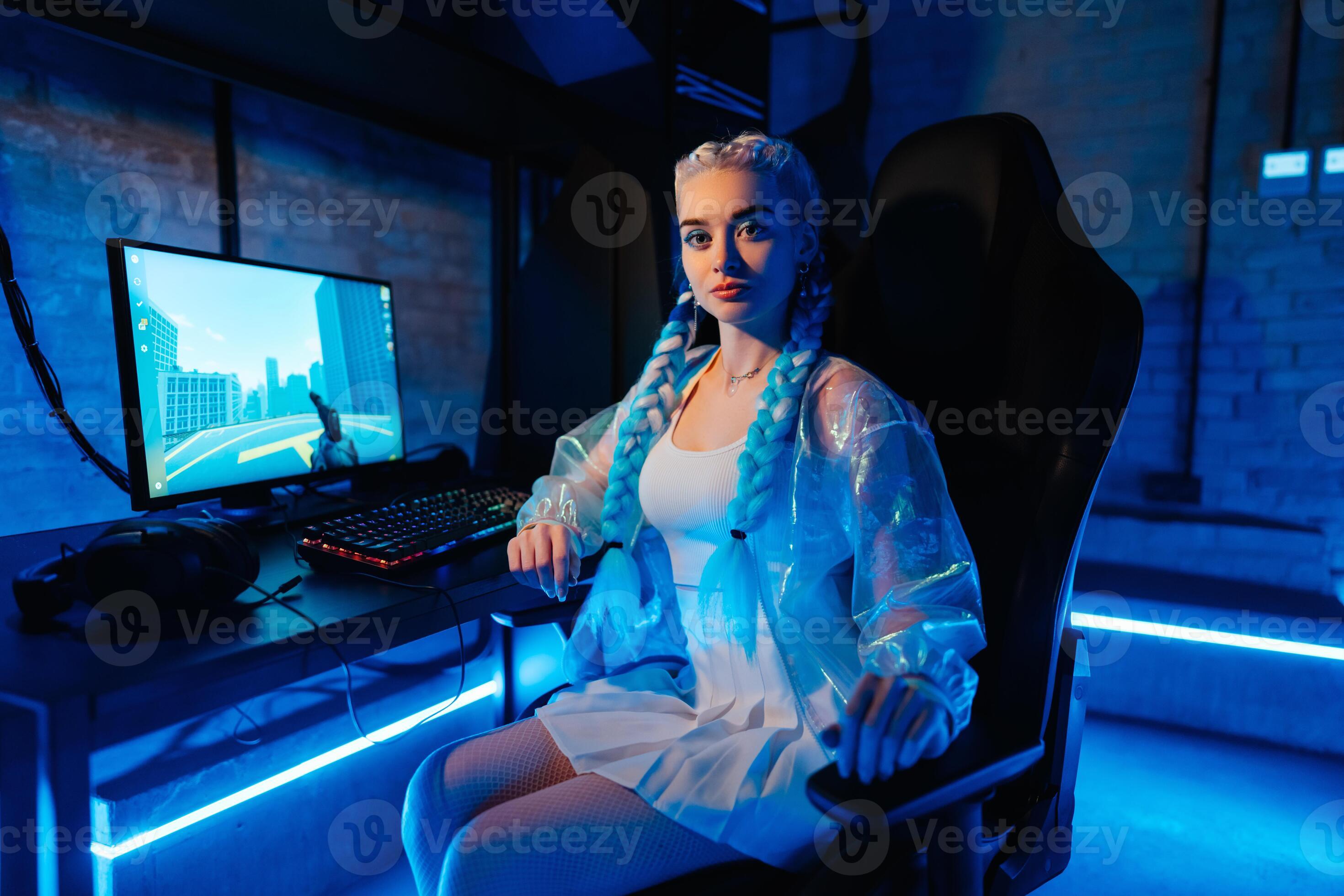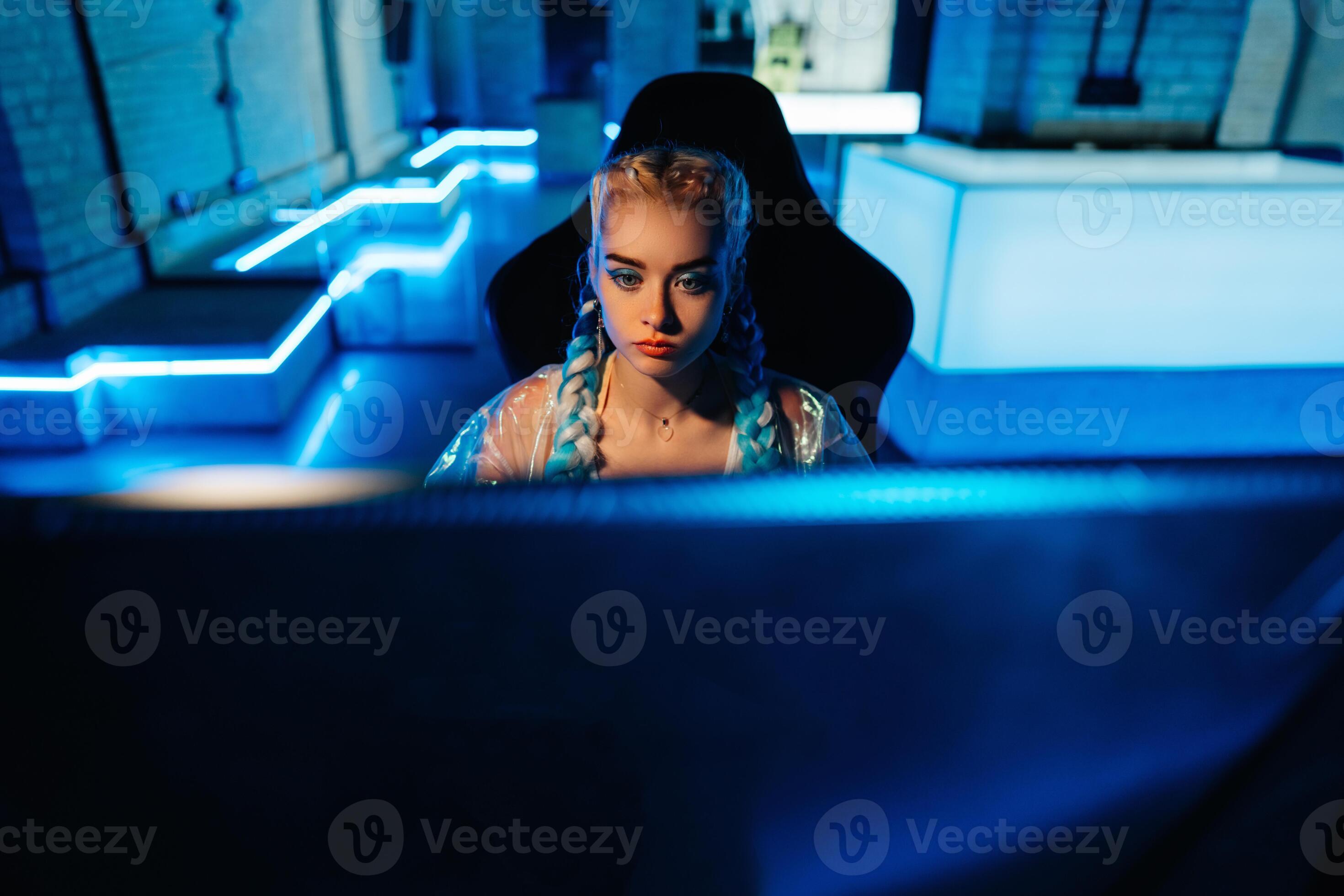 Young female blogger gamer plays games on computer Neon computer club