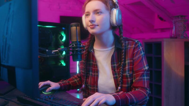 Caucasian Girl Teenager Gamer Cyber E sport Play Video Game Online