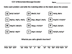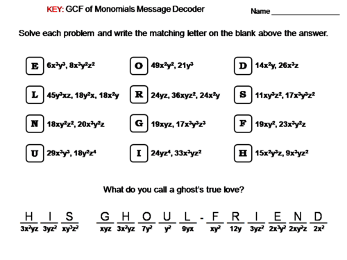 Greatest Common Factor GCF of Monomials Worksheet: Math Message Decoder