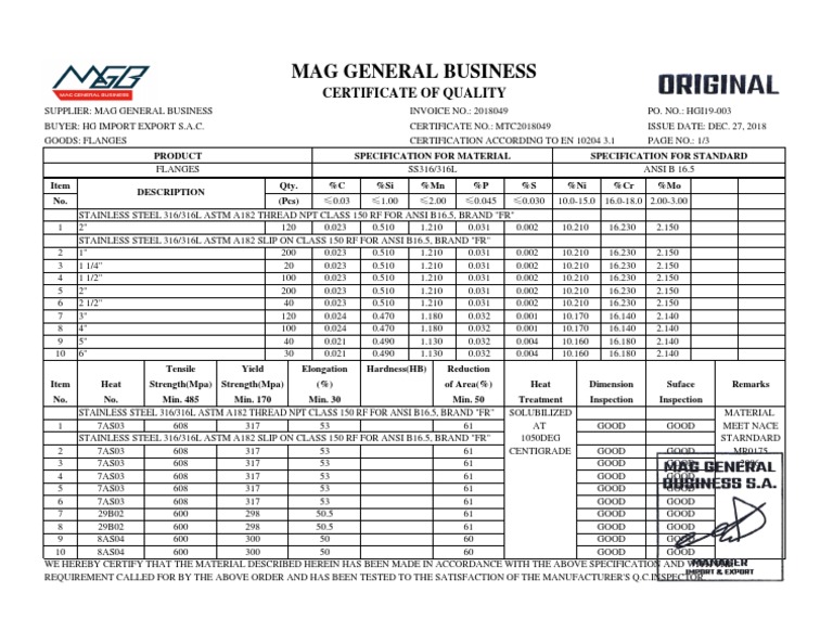 Mag General Business: Certificate of Quality PDF Metals Chemistry
