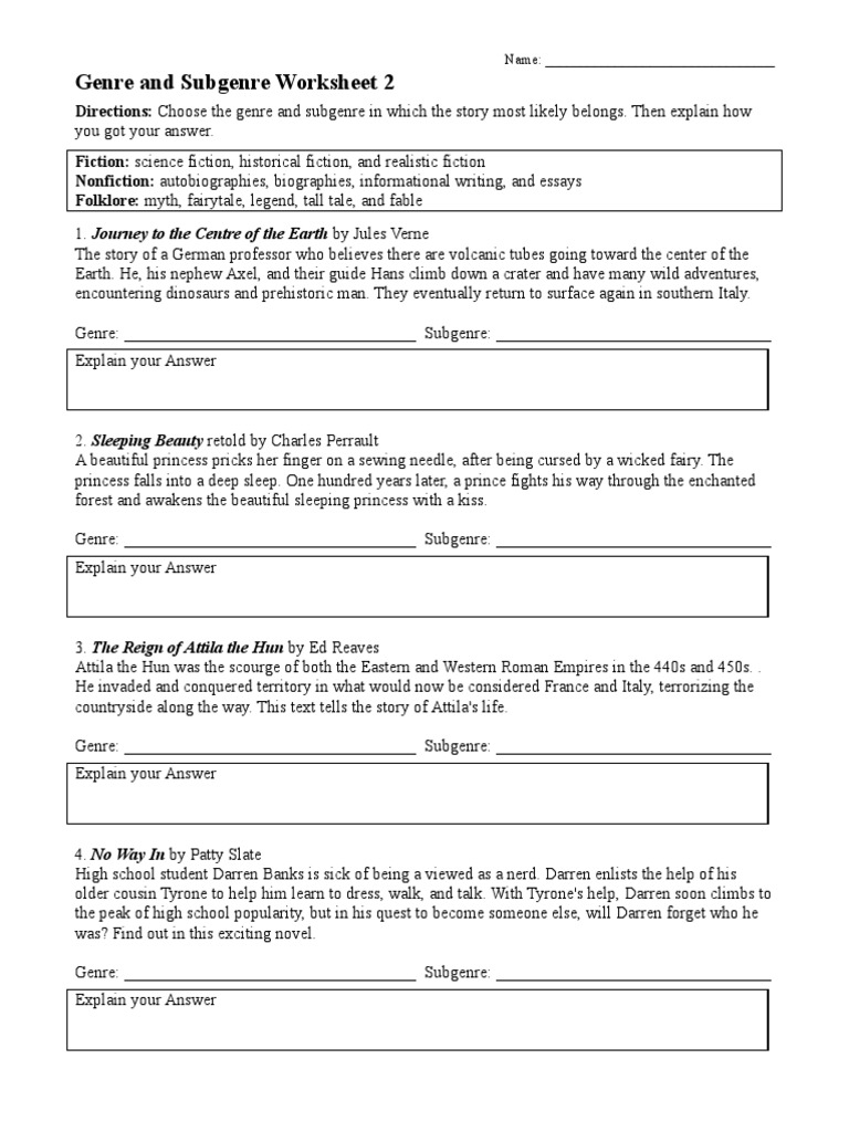 Genre and Subgenre Worksheet 2: Name Download Free PDF Unrest
