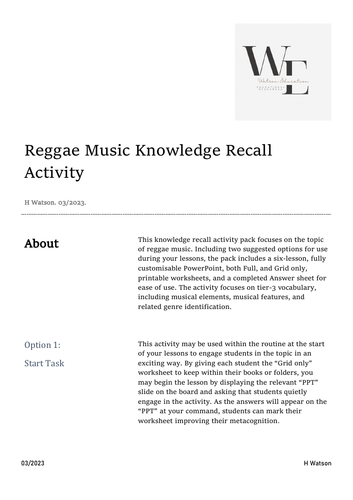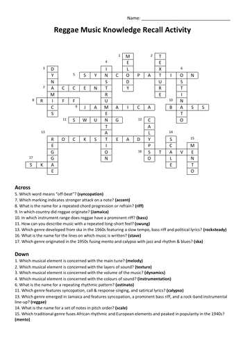 Reggae Music Knowledge Recall Activity Crossword Teaching Resources