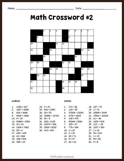 Free Printable Math Crossword Puzzle with Addition and Subtraction