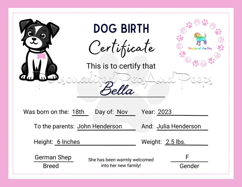 Female Dog Birth Certificate Printable PNG Pet Birth Certificate Gift