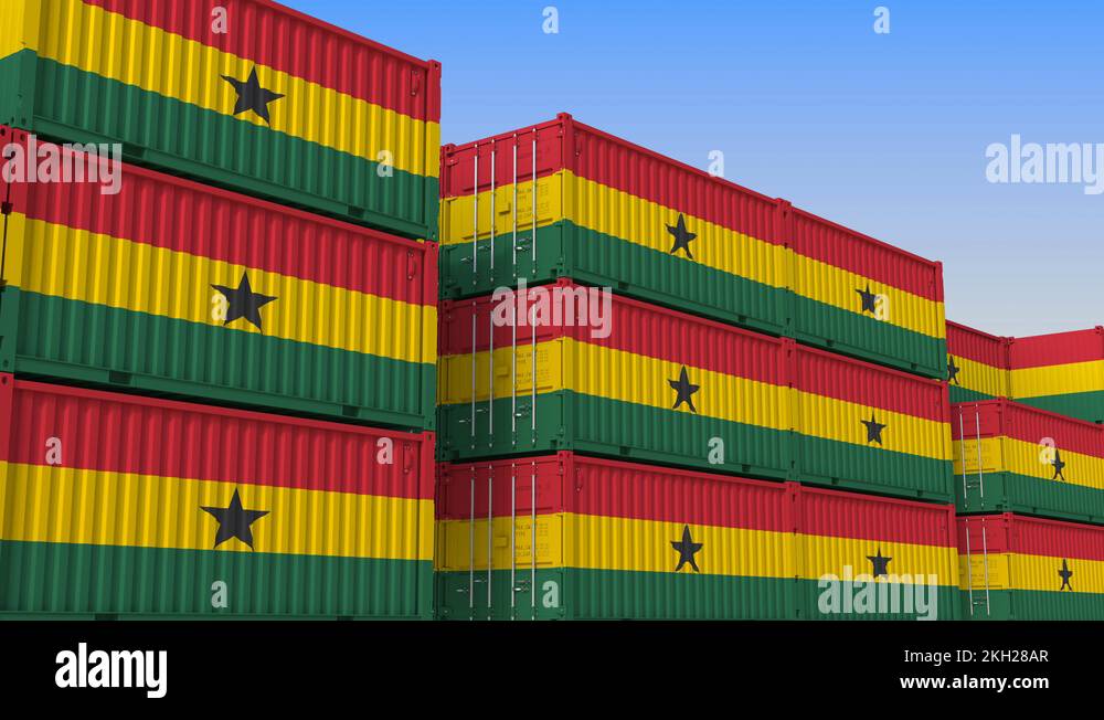 Container yard full of containers with flag of Ghana Ghanaian export