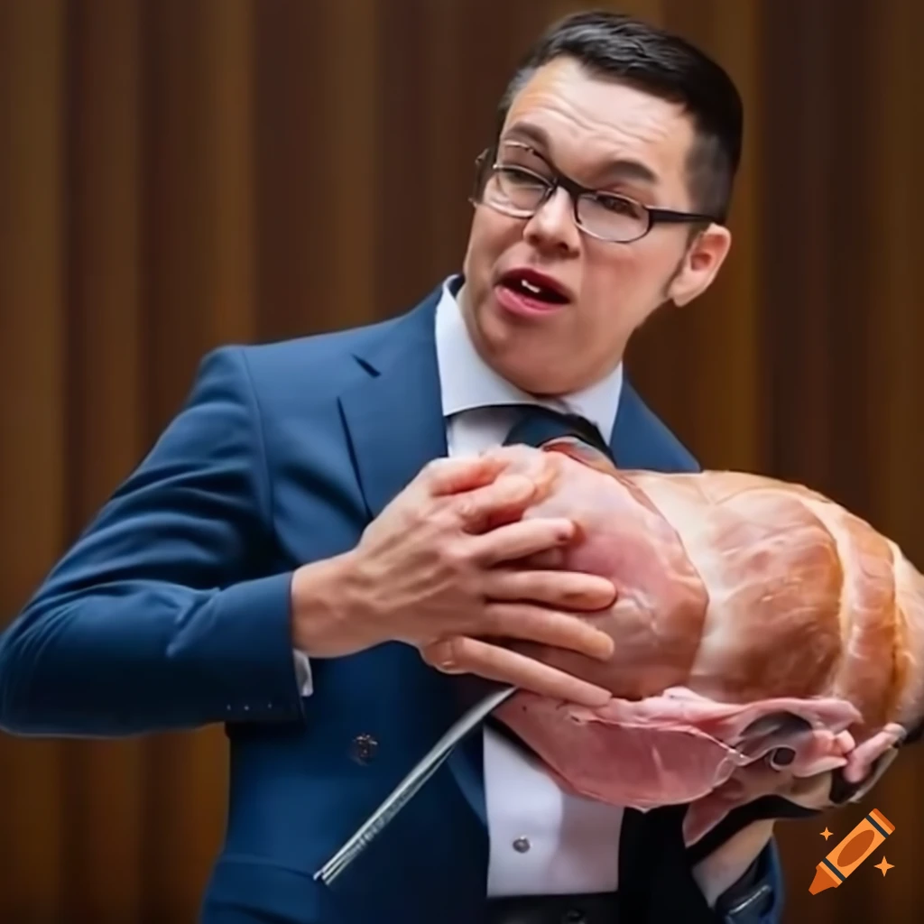 Satirical image of pierre poilievre eating a giant ham on Craiyon