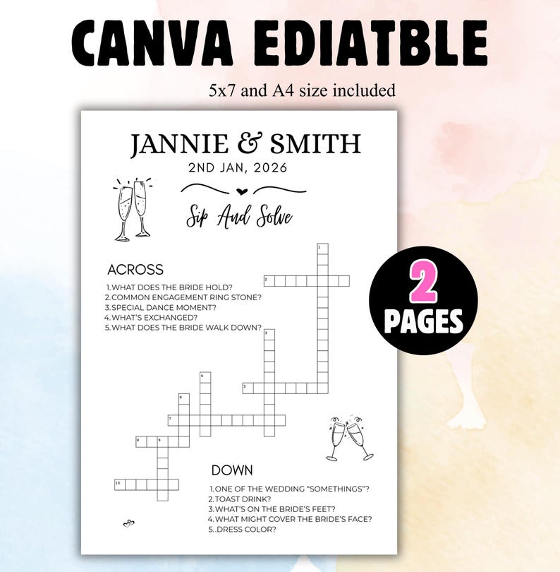 Wedding Crossword Puzzle Sip and Solve Crossword Puzzle Wedding