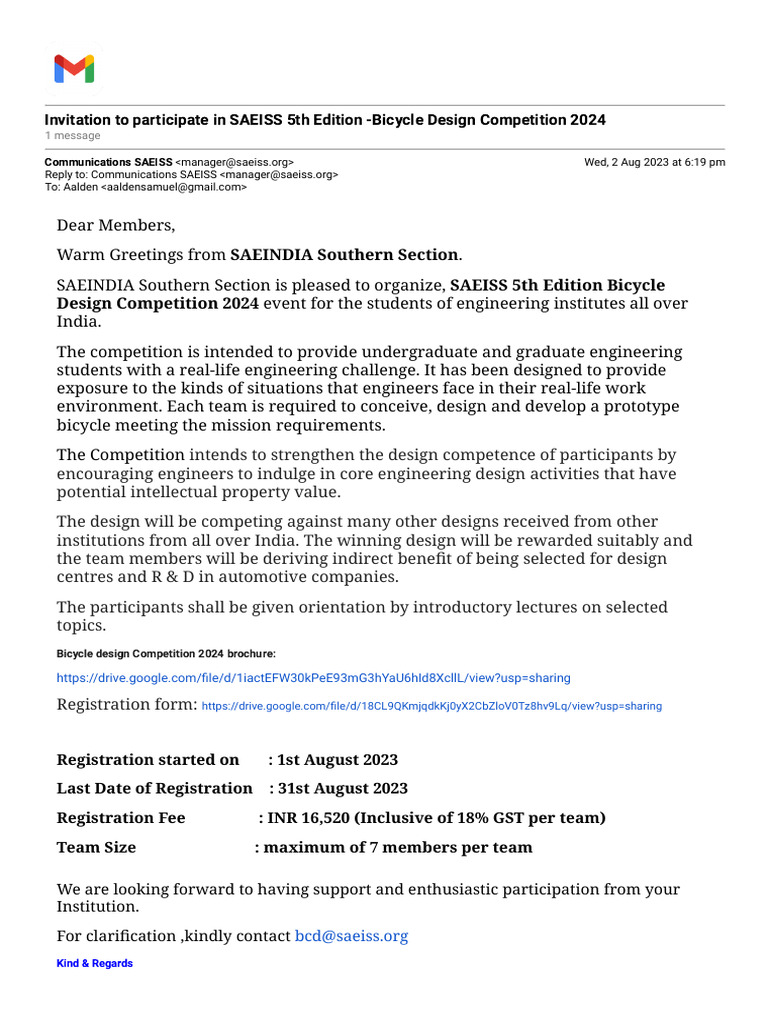 Gmail Invitation To Participate in SAEISS 5th Edition Bicycle