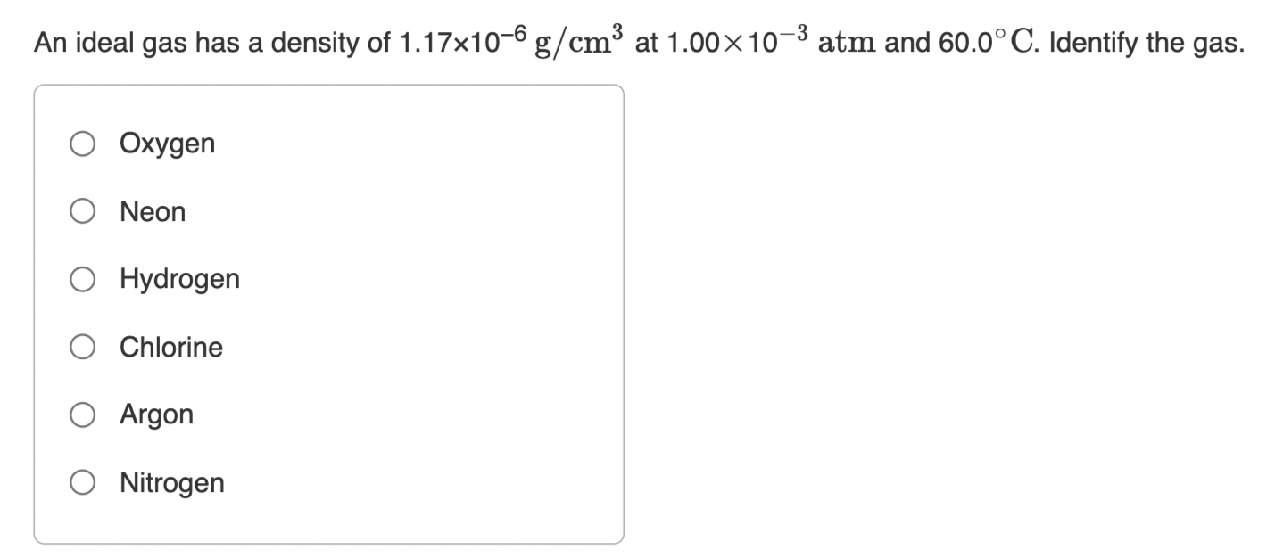 Solved An ideal gas has a density of 1 17×10−6 g/cm3 at Chegg com