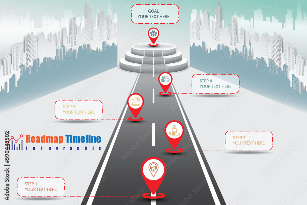 Business roadmap to goal on podium timeline infographic template with