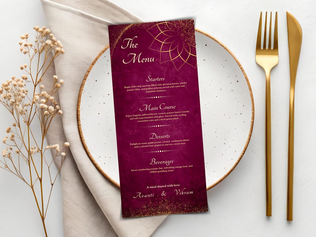 Indian Griha Pravesh Menu Template Burgundy Gold Wedding Menu