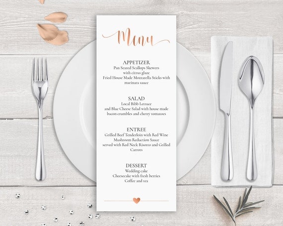 This rose gold wedding menu template enables you to create your own