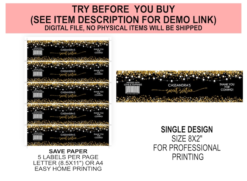 Editable Gold Black Water Bottle Label Birthday Water Bottle Label Gold
