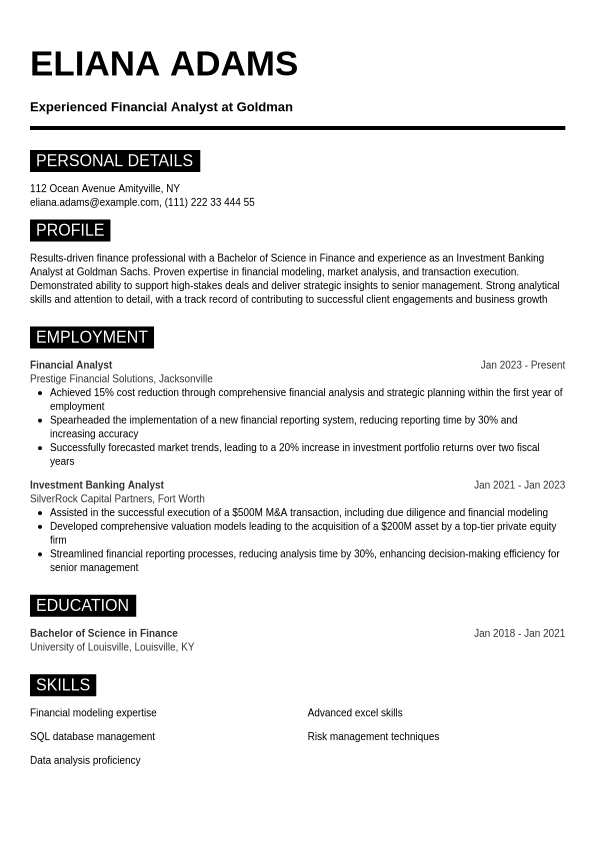 Goldman Sachs Investment Banking Resume Template