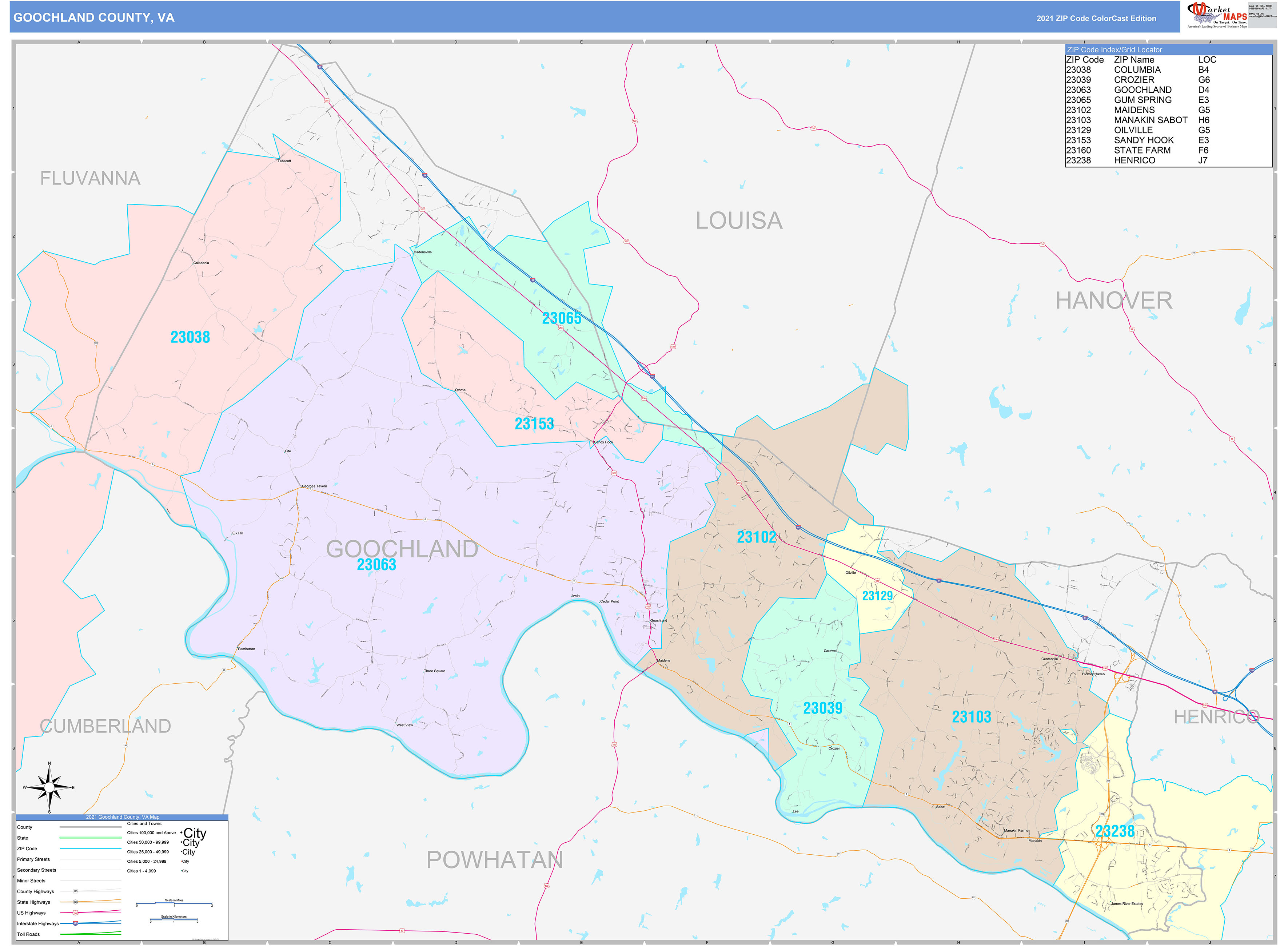 Goochland County VA Wall Map Color Cast Style by MarketMAPS MapSales