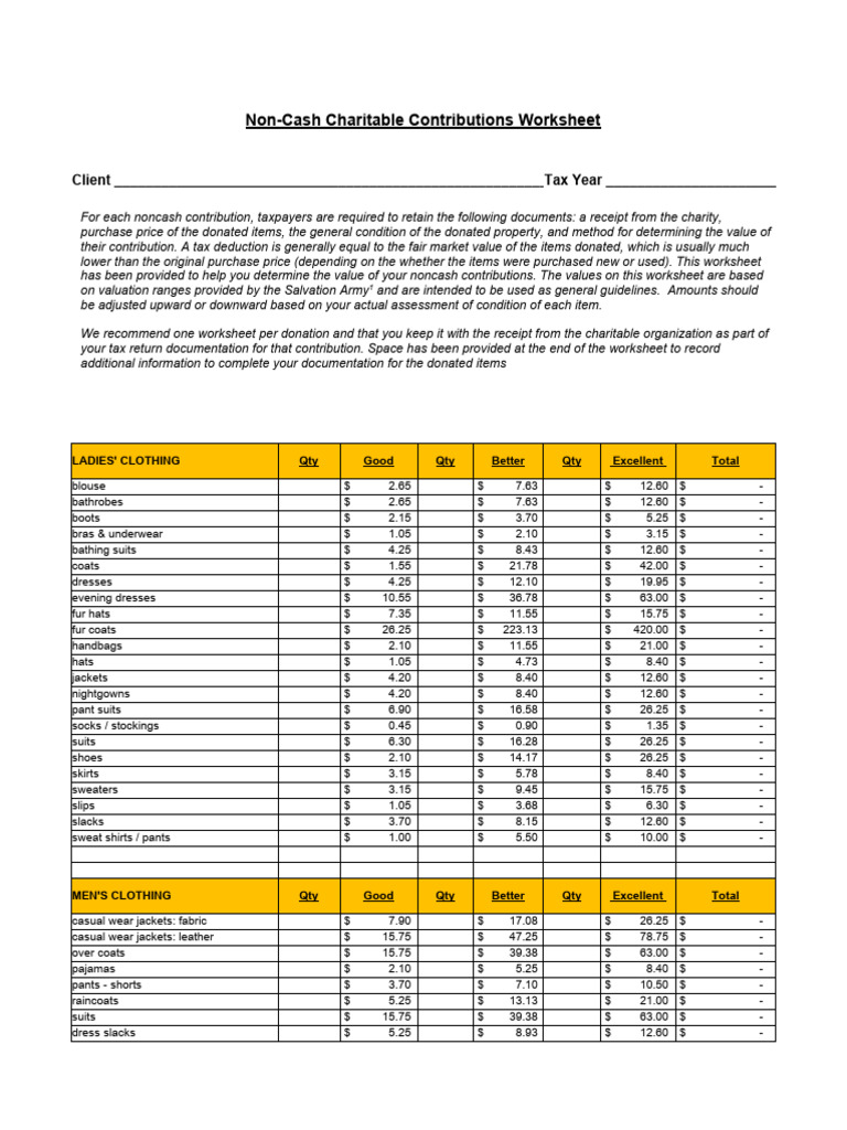 Non cash Donations Worksheet Template Aapril Tax Service Inc