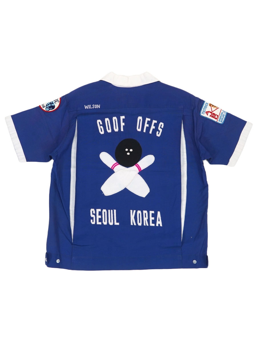 60 #39 s~ A RI RANG #39 #39 GOOF OFFS SEOUL KOREA #39 #39 背面ワッペン スーベニアボーリングシャツ ブルー 実寸(M