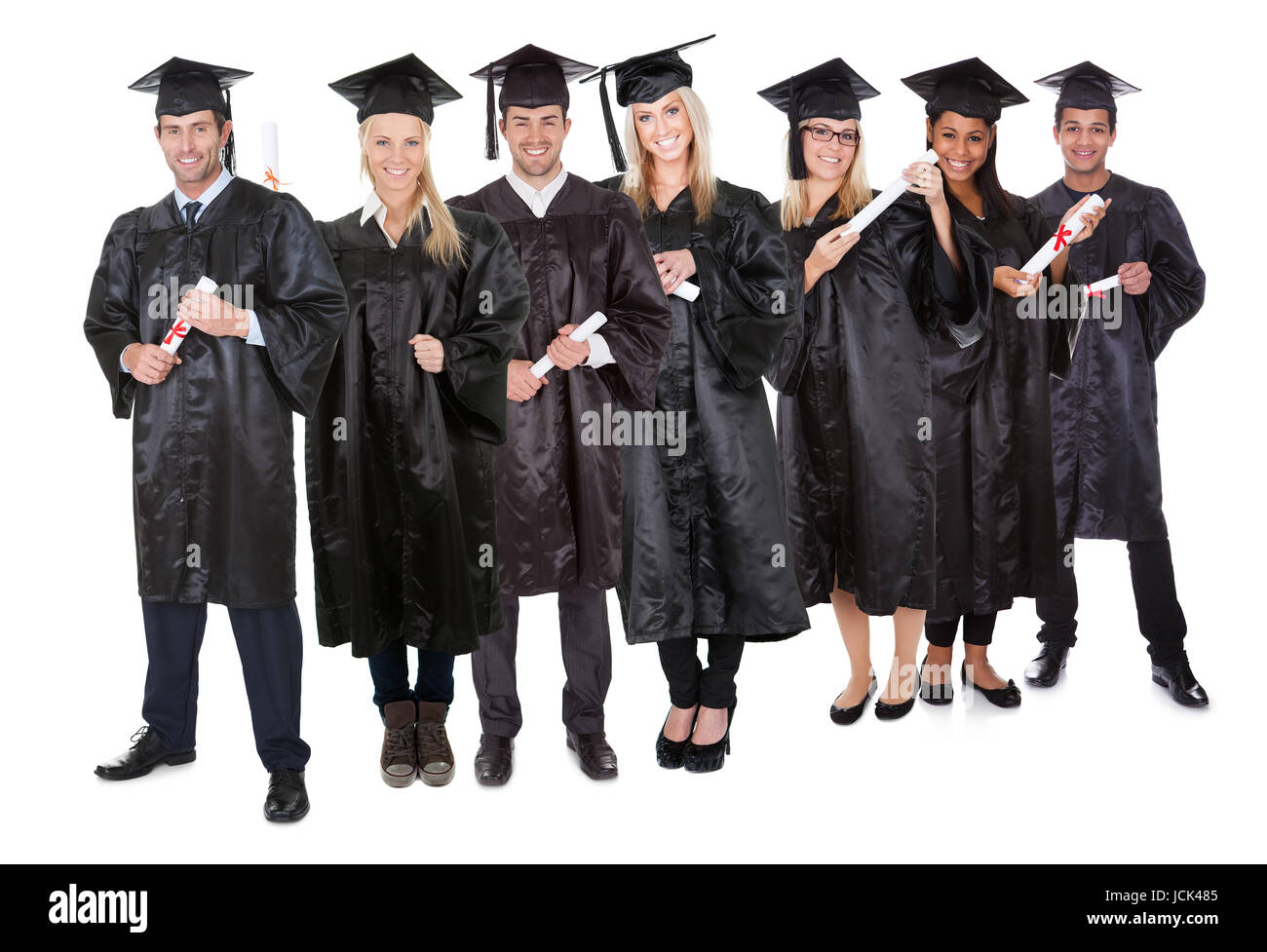 Happy Smiling Graduate Students In Graduation Gowns Holding Diplomas