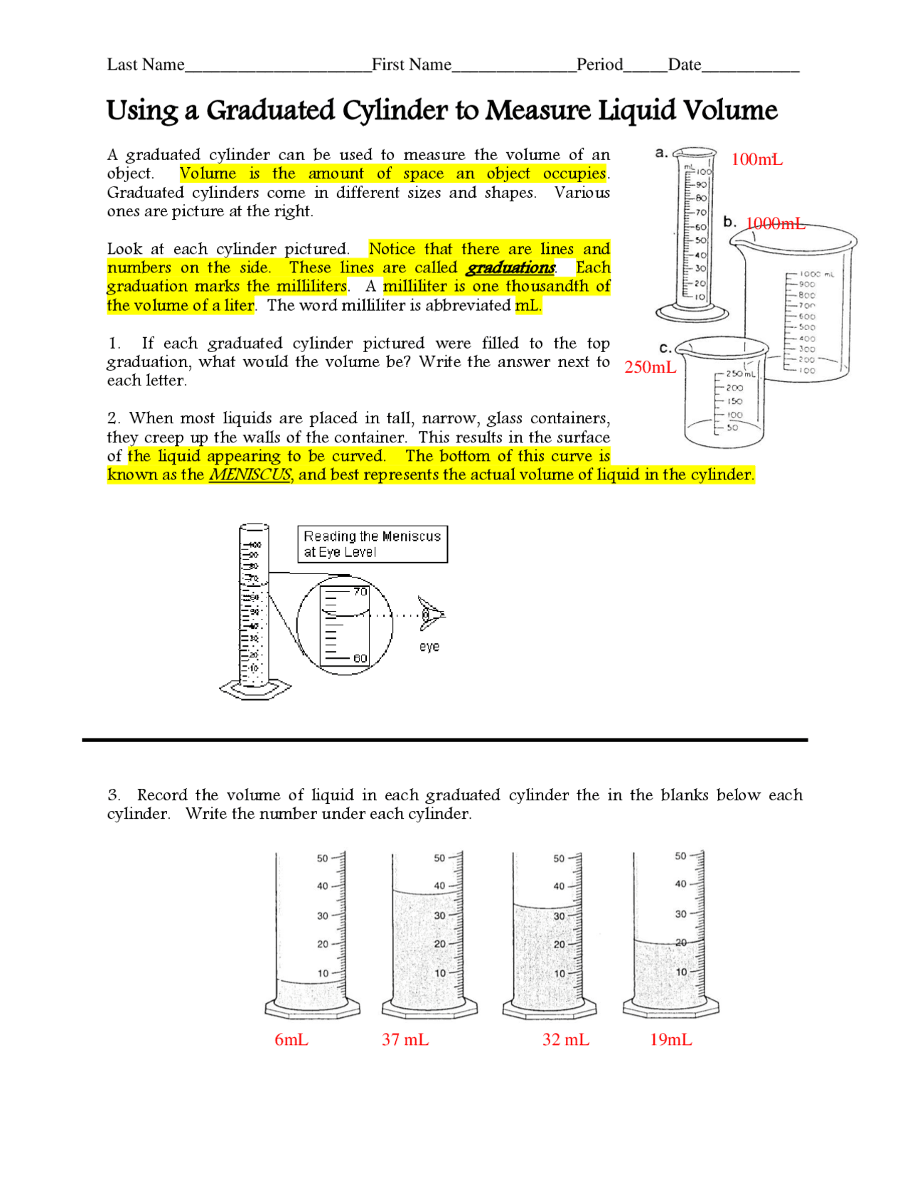 Graduated Cylinder Worksheet