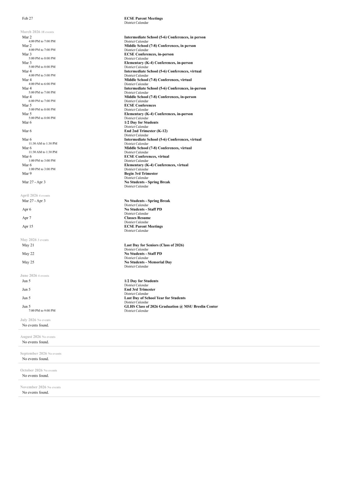 High School Calendar Family/Student Resources Grand Ledge High