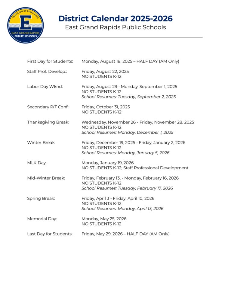 East Grand Rapids Public Schools MI Calendar 25 26 Revised pdf