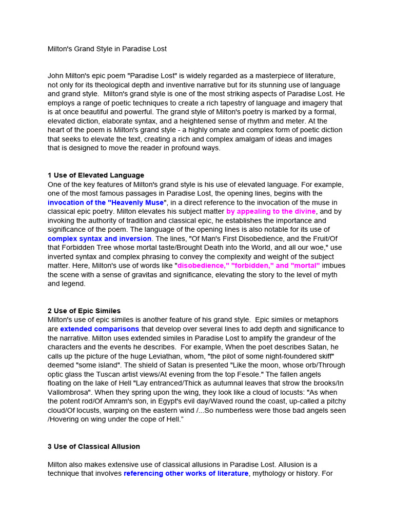 Milton Grand Style in Paradise Lost PDF Paradise Lost Poetry