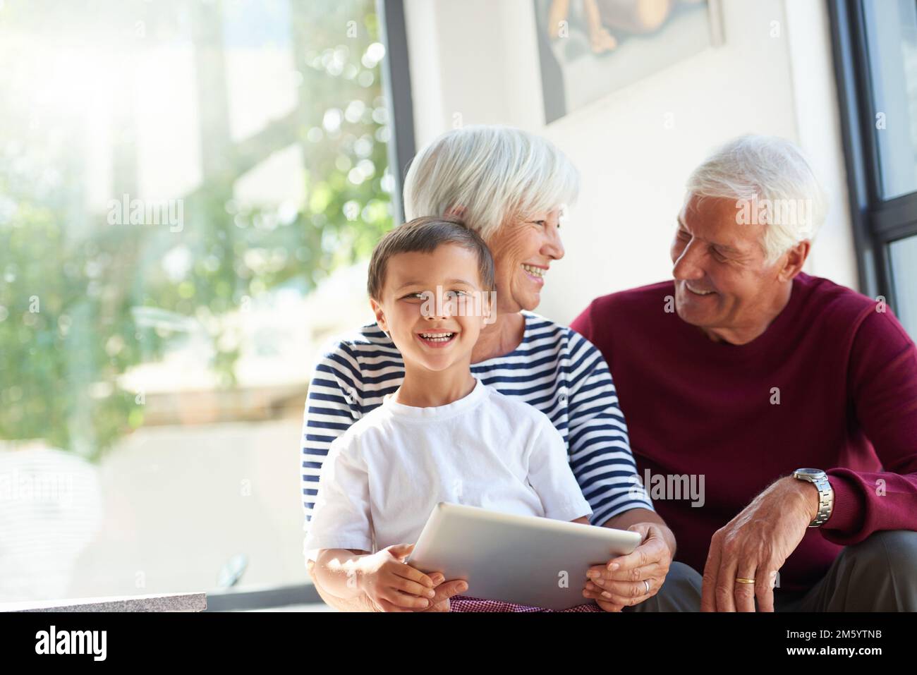 He loves visiting grandma and grandpa a little boy holding a tablet