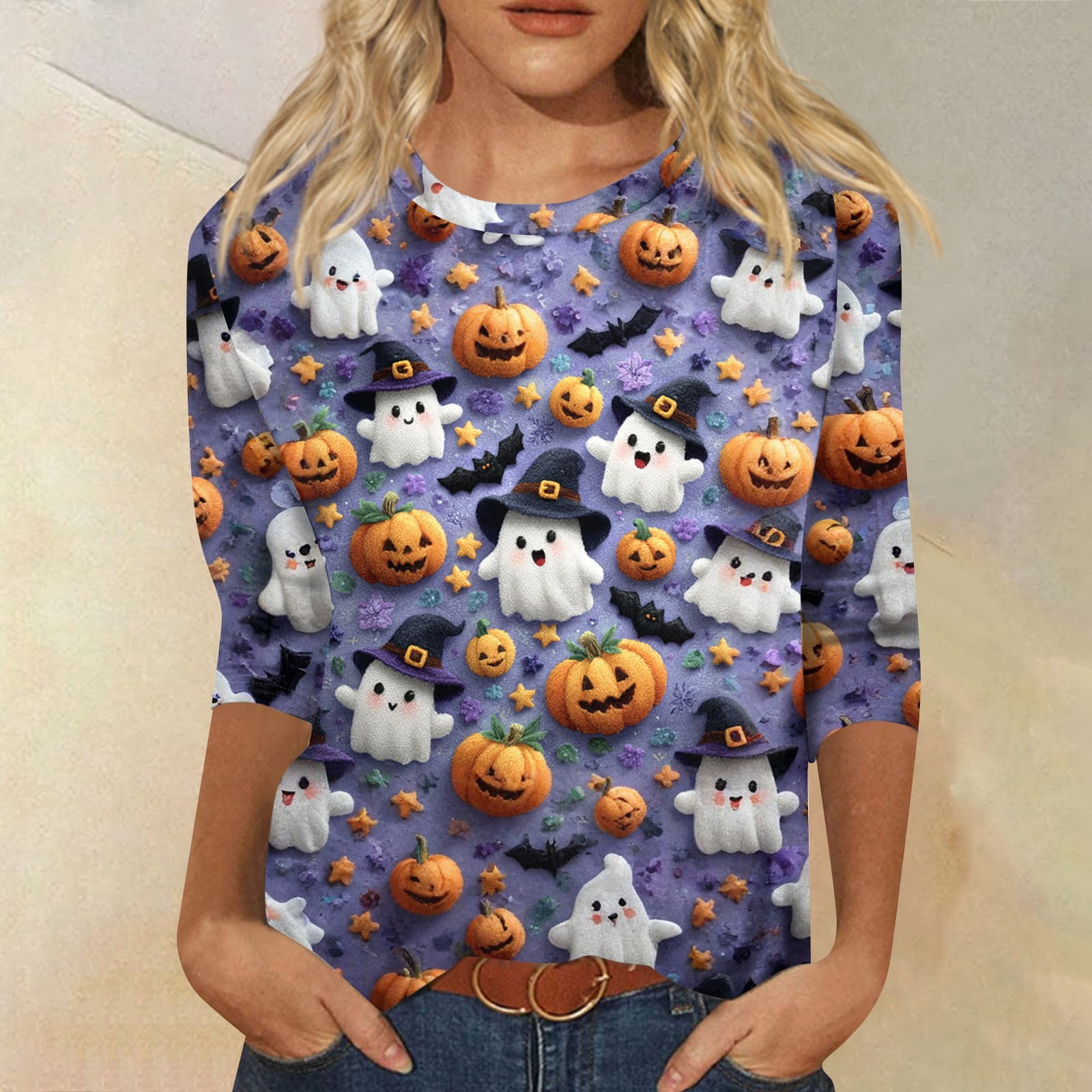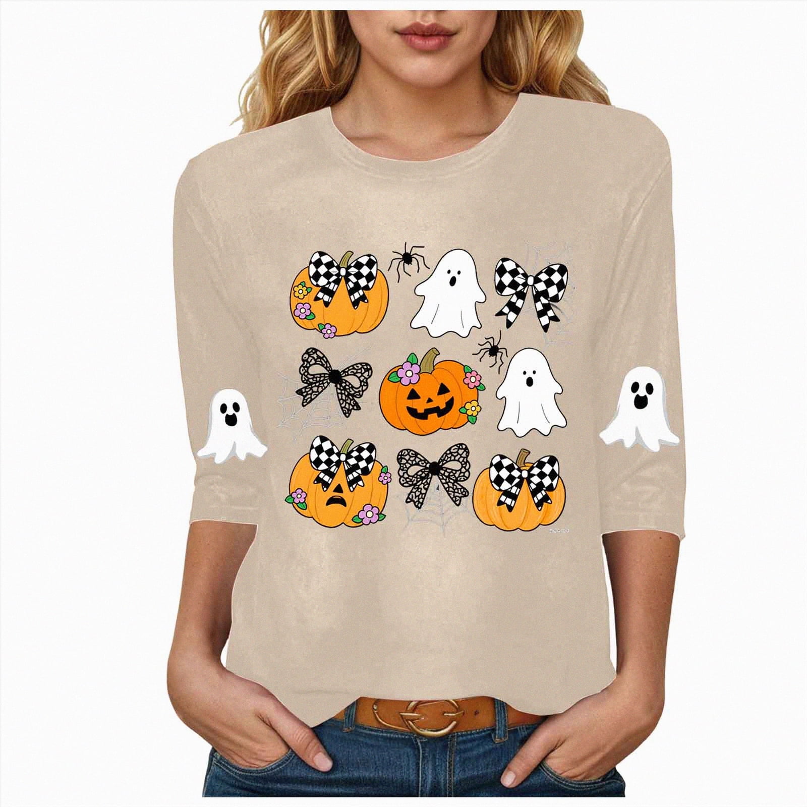 Halloween Shirts for Women 3/4 Sleeve Graphic Tees Cute Ghost Print