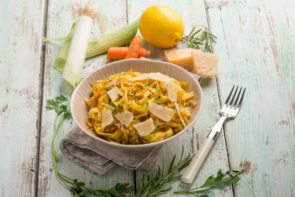 pasta with carrot parmesan flakes and grated lemon peel Stock Photo by