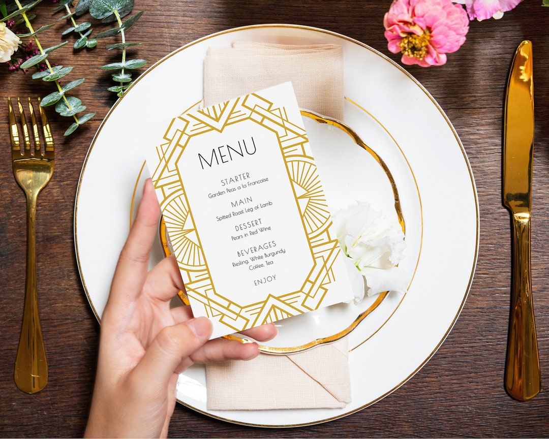 Customisable Dinner Party Menu With Great Gatsby Art Deco Theme