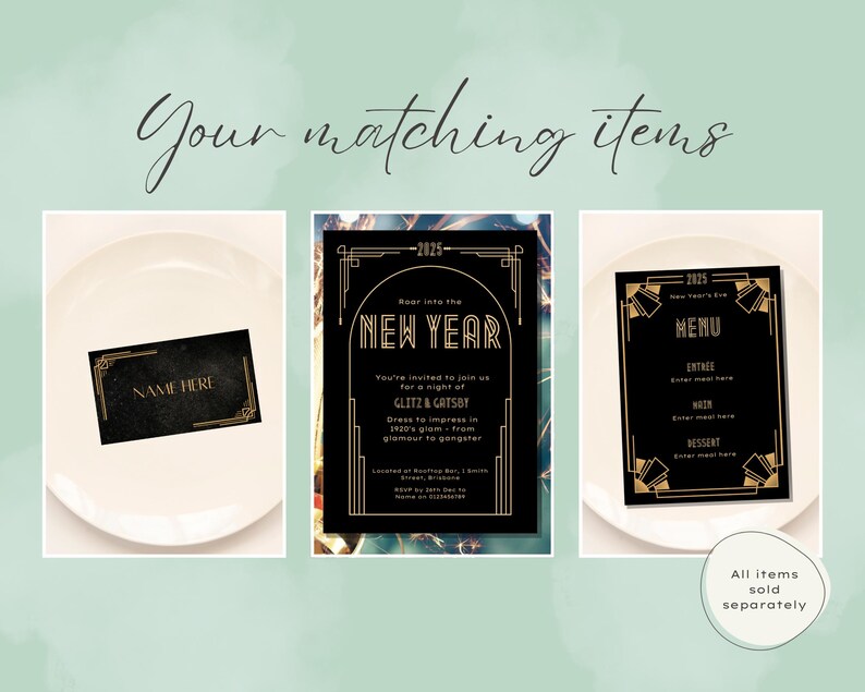 Art Deco Menu for Roaring 20s New Year #39 s Eve Party Black Gold 5x7