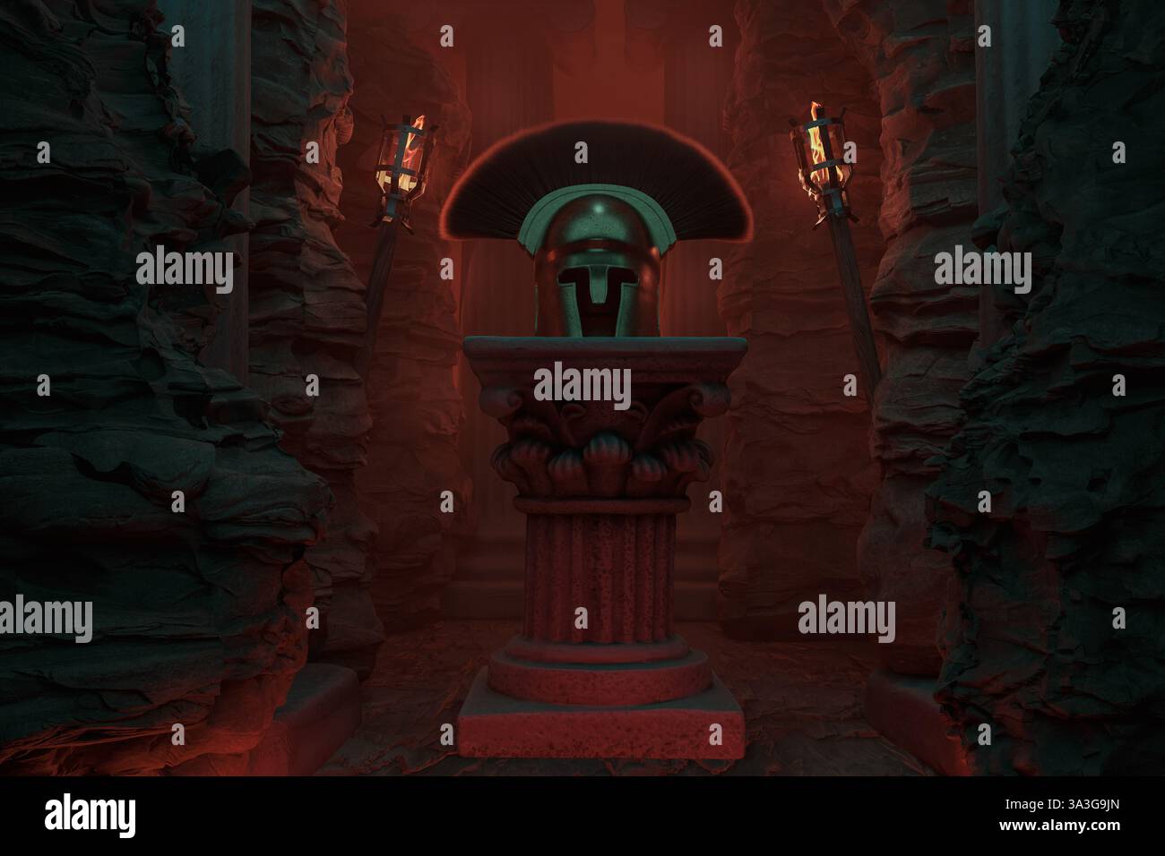 3d rendering of ancient greek Sparta type helmet laying on greek column
