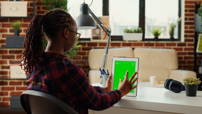 Female Worker Vertically Holding Modern Gadget with Green Screen