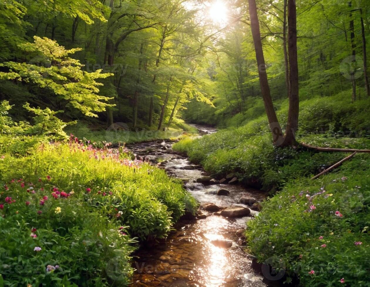 AI generated Beautiful spring forest landscape Stream and trees AI