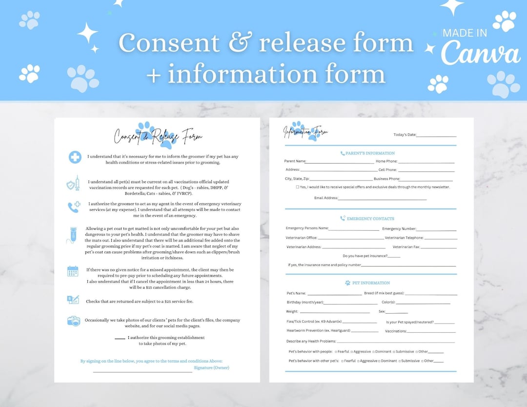 Dog/pet Grooming Business Forms Consent and Release Form Etsy