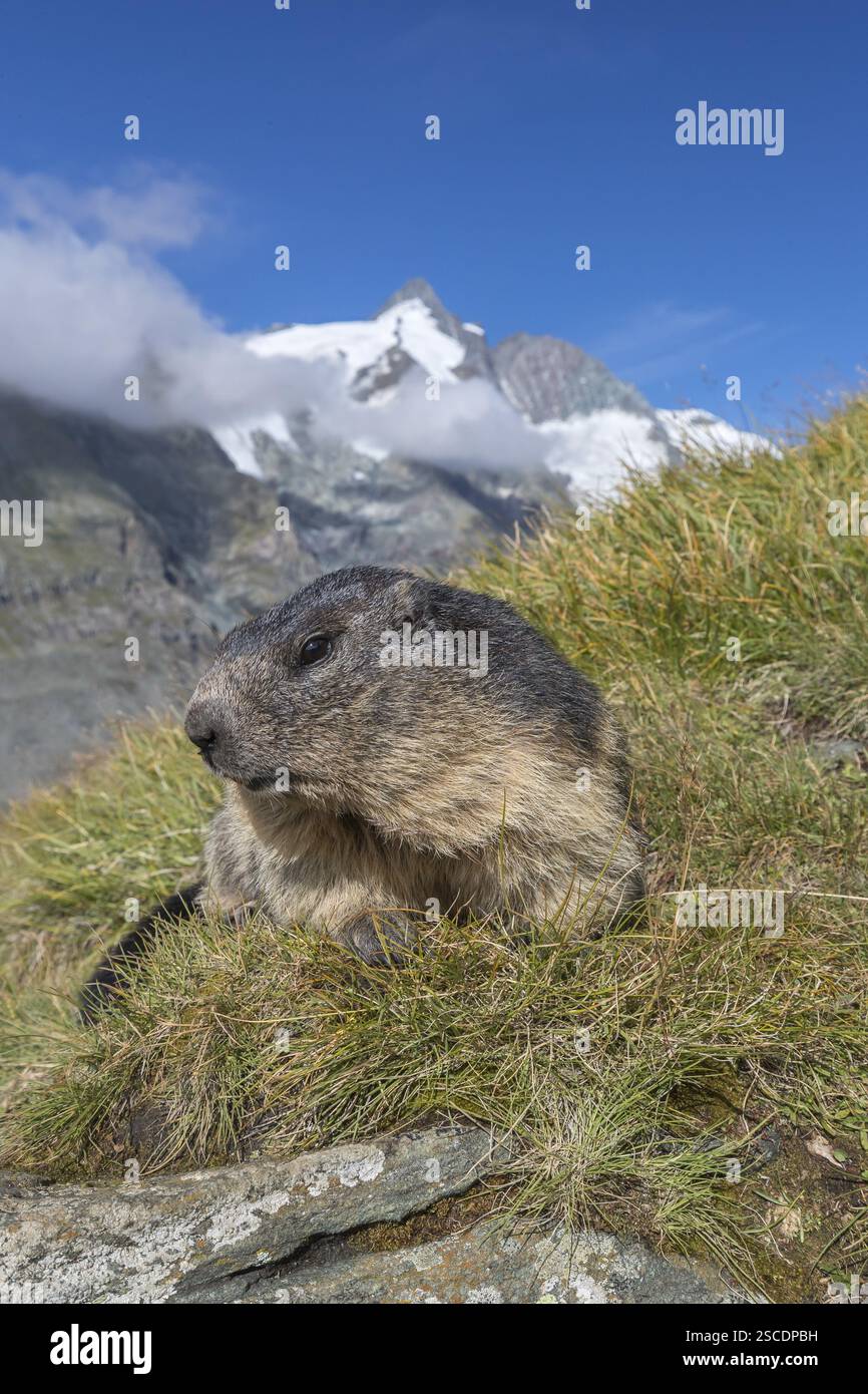 OneAlpine Marmot Marmota marmota sitting in front of the
