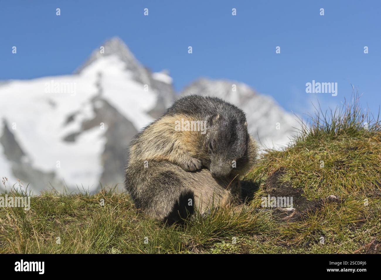 OneAlpine Marmot Marmota marmota and one young marmot grooming