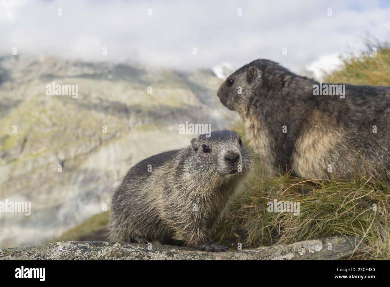 TwoAlpine Marmot Marmota marmota and one young marmot standing