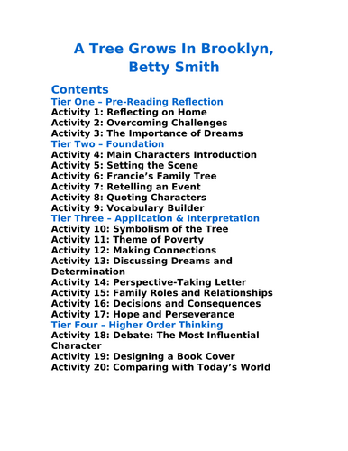 A Tree Grows In Brooklyn Betty Smith 20 Differentiated Activities