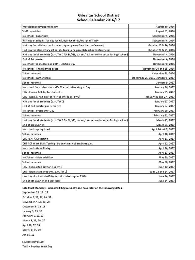 Gibraltar School Calendar 2016 17 PDF