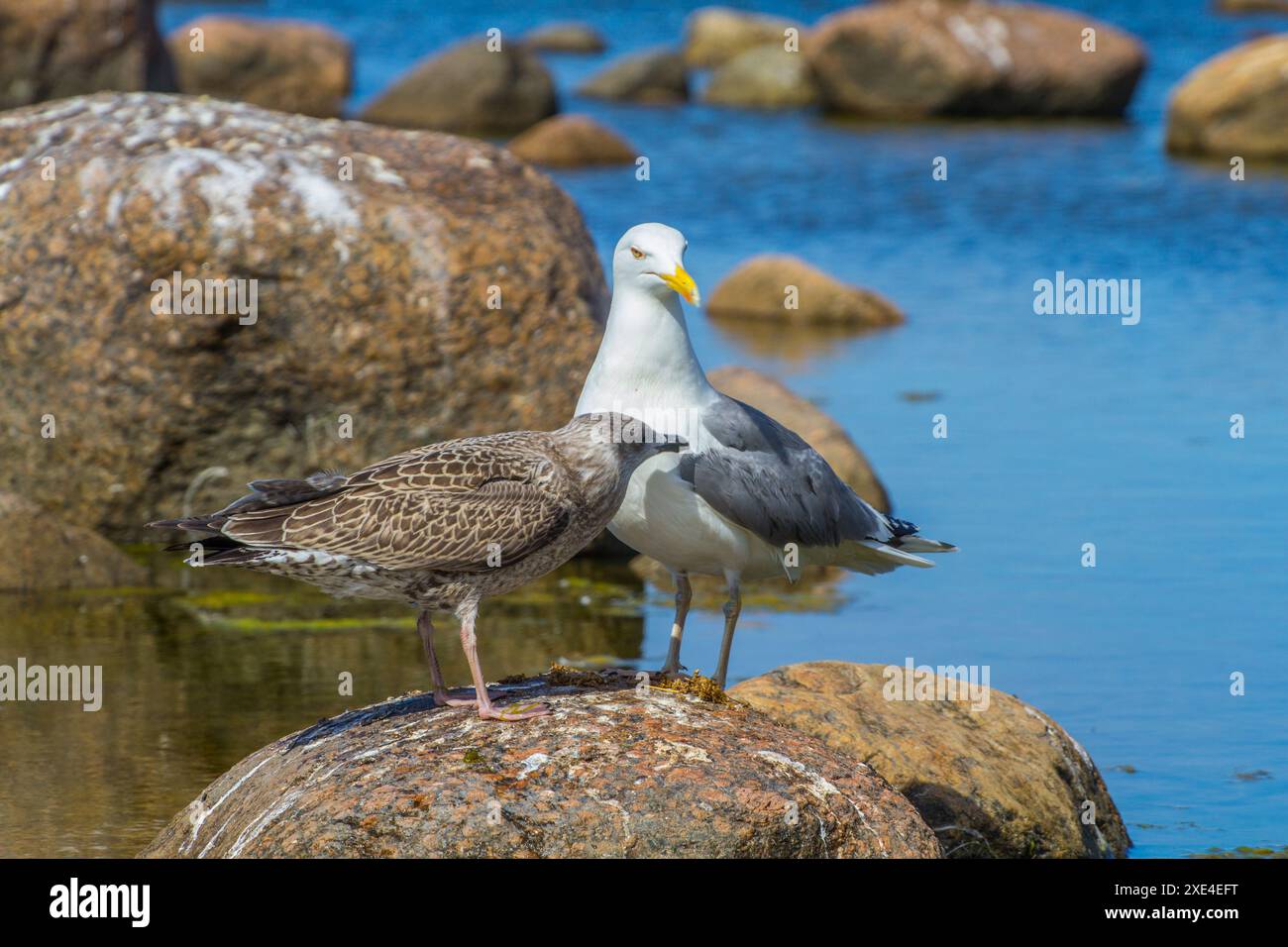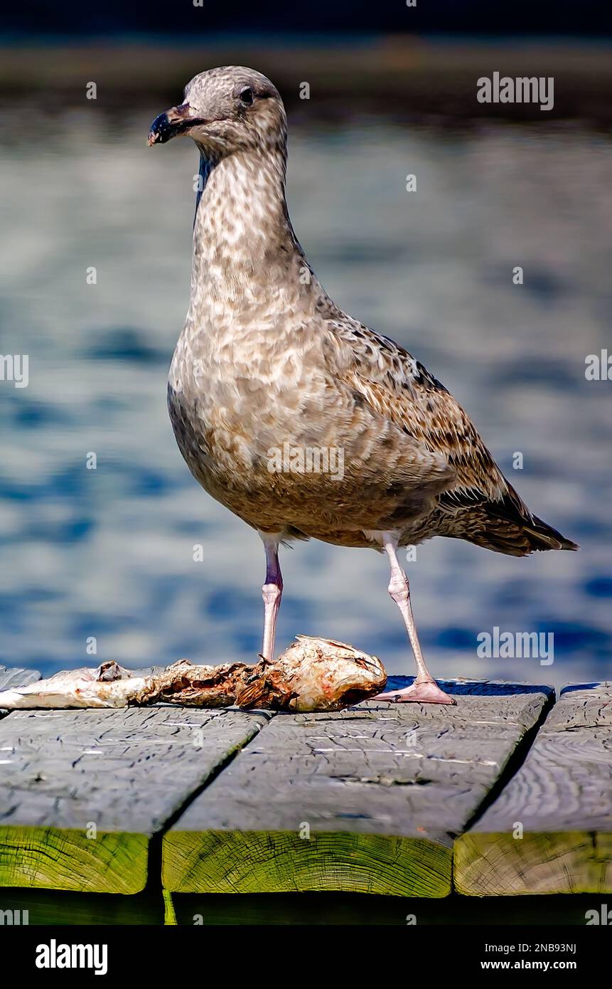 A juvenile American herring gull (Larus argentatus) feeds on a dead