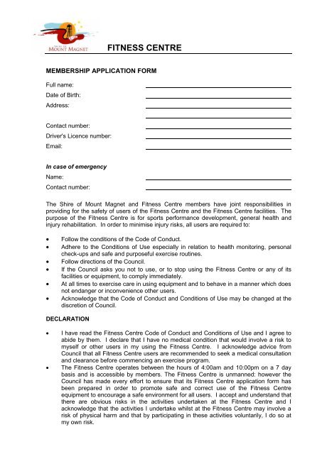 Fitness Centre Membership Application Form Shire Of Mount Magnet